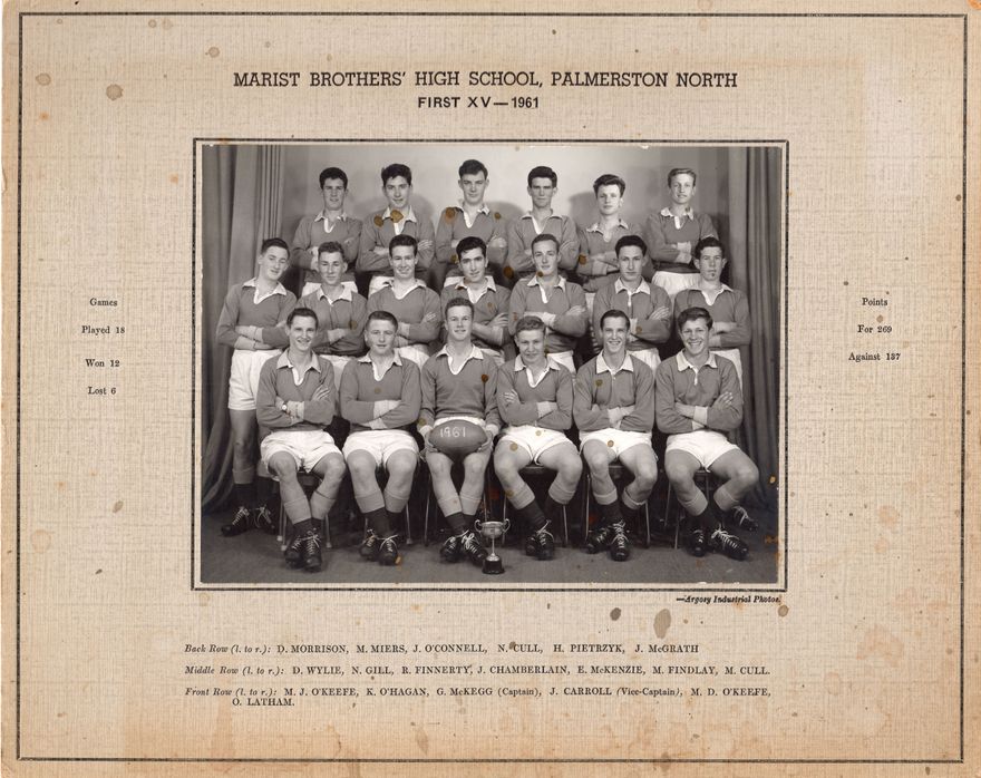 - Back row: D. Morrison, M Miers, J. O'Connell, N. Cull, H. Pietrzyk, J. McGrath. Middle row: D. Wylie, N. Gill, R Finnerty, J. Chamberlain, E. McKenzie, M. Findlay, M. Cull. Front row: M.J. O'Keefe, K. O'Hagan, G. McKegg, J. Carroll, M.D. O'Keefe, O. Latham. - Marist Brothers' High School opened in 1939 and became a full secondary school in 1942. It closed in 1974, with the opening of St Peter's College.
