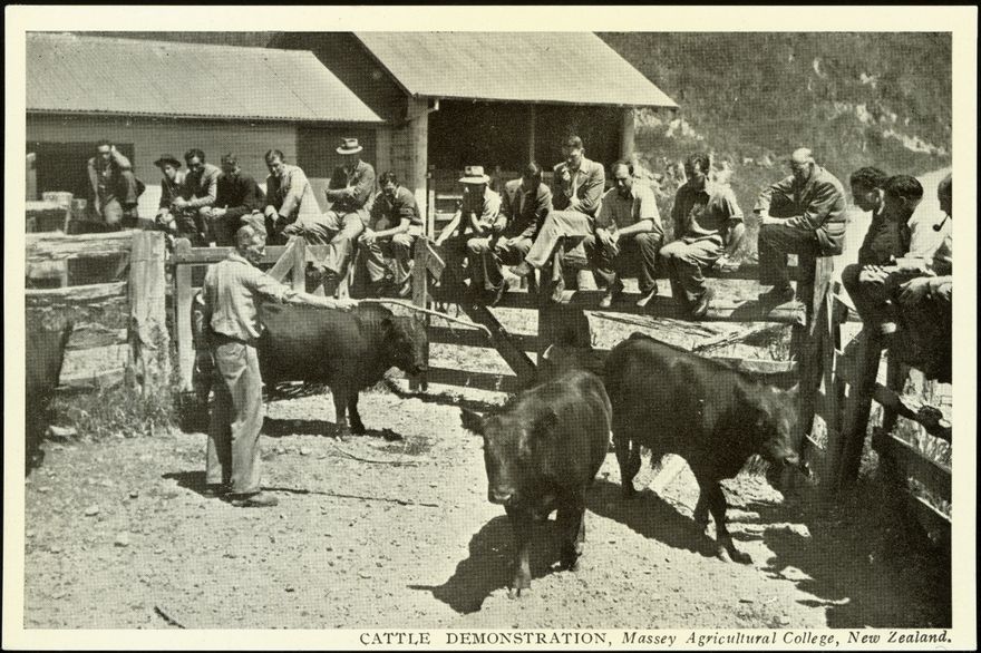 Massey Agricultural College was opened in 1928. This postcard shows a cattle demonstration.