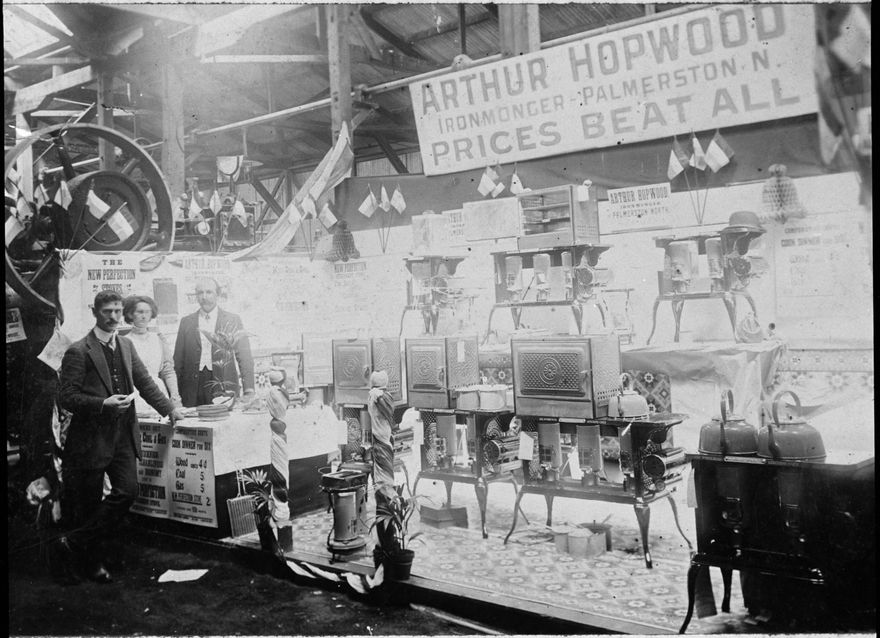 Arthur Hopwood, on the right of the sales people, stands at his trade display of Ironmongry goods, including a number of cooking stoves. The display is at an Agricultural and Pastoral (A&P) Asssociation Show.