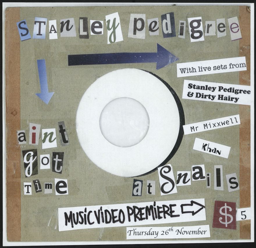 Stanley Pedigree. Ain't got time. With live sets from Stanley Pedigree & Dirty Hairy. Mr Mixxwell. Khan. at Snails. Music video premier. $5. Thursday 26th November. Part of a collection of posters that were displayed at The Stomach, Lombard Street, venue for Creative Sounds Society Incorporated.