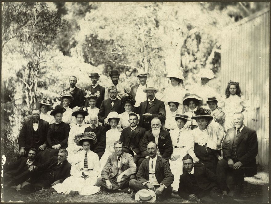 In this photograph, we see the members of the Borough Council and their wives at the annual Mayoral Picnic at Tiritea. The newly built Tiritea Dam was also officially declared open by the Mayoress, who cut the ribbon. After inspecting the dam the party were given afternoon tea. Identified in the photograph are: Mayor J.A. Nash - 6th man from left, second row; His wife, Mayoress Elizabeth Nash is on his left; Councillor Edward John Armstrong is possibly on her left; W.H. Collingwood front row, second from right with the hat with grey ribbon; H Palmer second from left, back row with the bow tie; W. Stubbs 3rd from left, back row in white suit; S Jickell second from left, front row. See also W4 and The Birth of Palmerston North, p 92.In July 1888, the Palmerston North Borough Council accepted a scheme to bring water from the Tiritea Stream to the city at a cost of £18,350. The contractors were Coates and Metcalf of Hamilton. The dam was situated seven miles east of Palmerston North and the water was piped first to a reservoir on Tiritea Hill and then to the city over the Fitzherbert Bridge. A second dam was constructed in 1906-1907 and then was raised in height and re-opened on 17th February 1913, submerging the original dam.The present dam was constructed in 1957. See also 2015P_pic15_006178