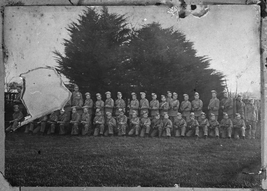 This photograph of armed children in uniform is possibly the College Street Boy's Cadets. Ernest R Mullens is among these boys, but unidentified.