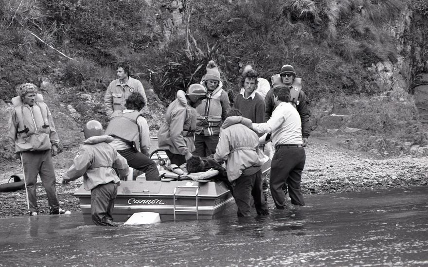This series of images were taken for a story that ran in The Manawatu Evening Standard on 22 September, 1978. The article details a mid-river collision in the Manawatū Gorge during the Manawatū River stage of the 1978 CItizen Watch Jet Boat Marathon. The two boats that collided were Campbell Wilkie's "The Ugly" and Hilton McLachlan's "Ruffian" (with Ross Baker and Charles Hughes as crew). A third boat skippered by Bryan Harvey sustained damage whilst avoiding the collision. The photograph of P. Bayens' boat included in the article was not found with the negatives.