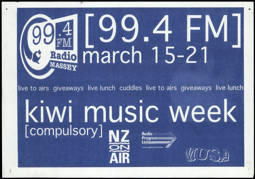 99.4 FM Radio Massey. [99.4 FM] march 15-21. live to airs giveaway live lunch cuddles. kiwi music week [compulsory]. NZ on Air. Audio progress Ltd. MUSA. Part of a collection of posters that were displayed at The Stomach, Lombard Street, venue for Creative Sounds Society Incorporated.