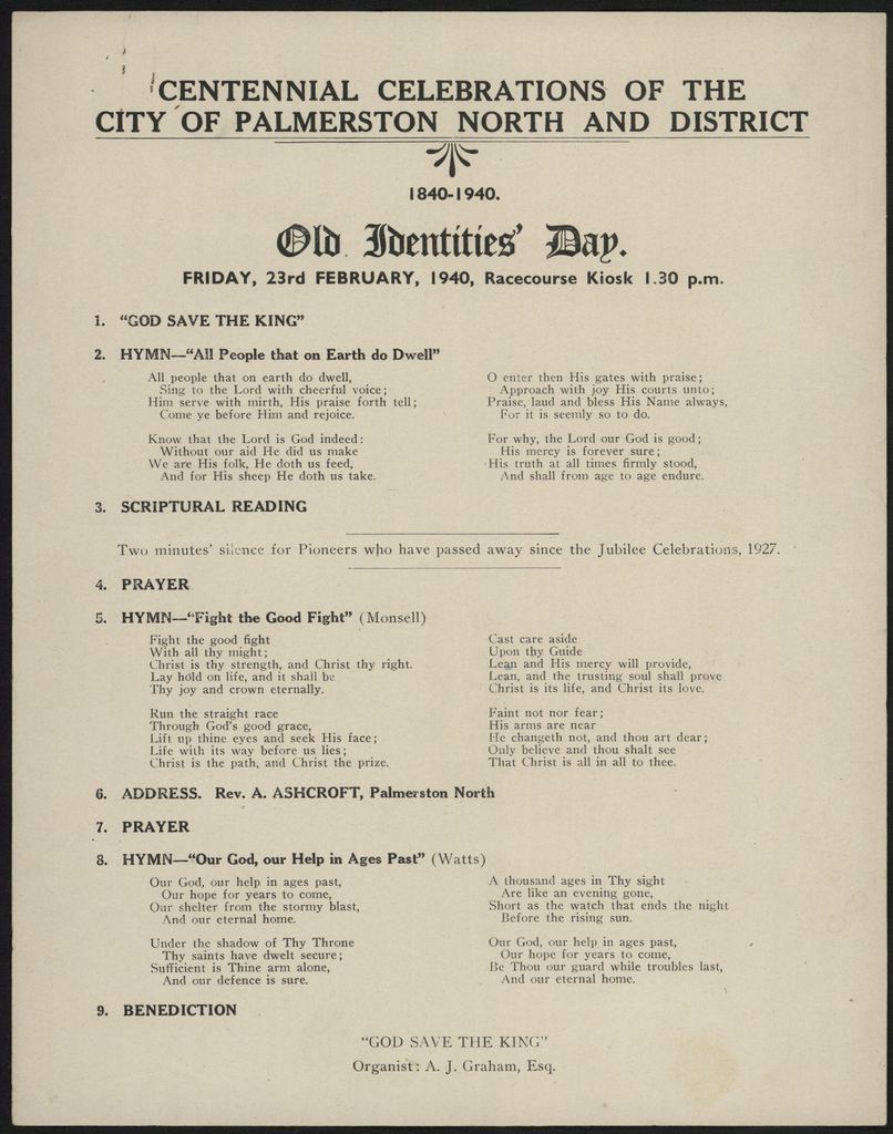 A programme from the "Old Identities' Day" held in Palmerston North as part of the nationwide celebrations of New Zealand's centennial.