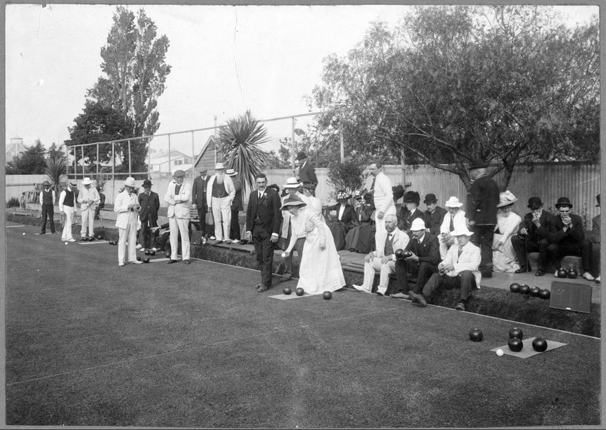 This photograph shows a group of people, including Mr and Mrs Nash, playing bowls, presumably at the Palmerston North Bowling Club where JA Nash was an active member. This image may be of one of their annual socials.