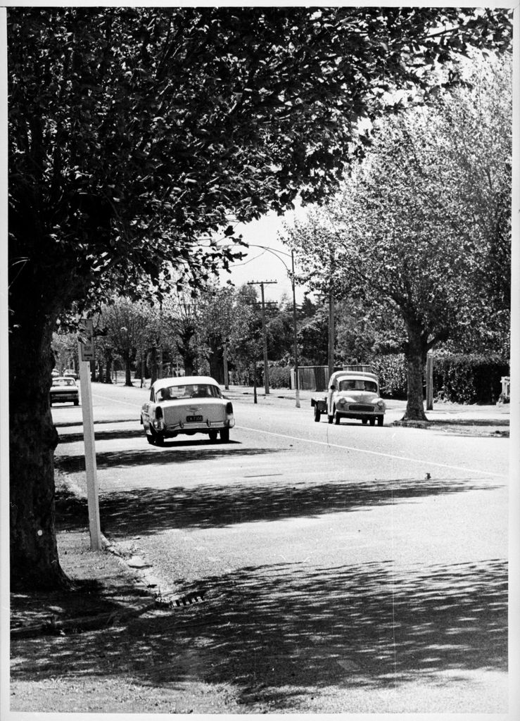This view of Fitzherbert Avenue shows some of the 70-80 year old trees that once lined the road. The trees were removed in the late 1990s - a move that was very controversial and garnered much debate and protests in the years leading up to their removal. The leading group of protesters was known as Avenue Action. Photograph published in Manawatu Evening Standard 17 October 1973.