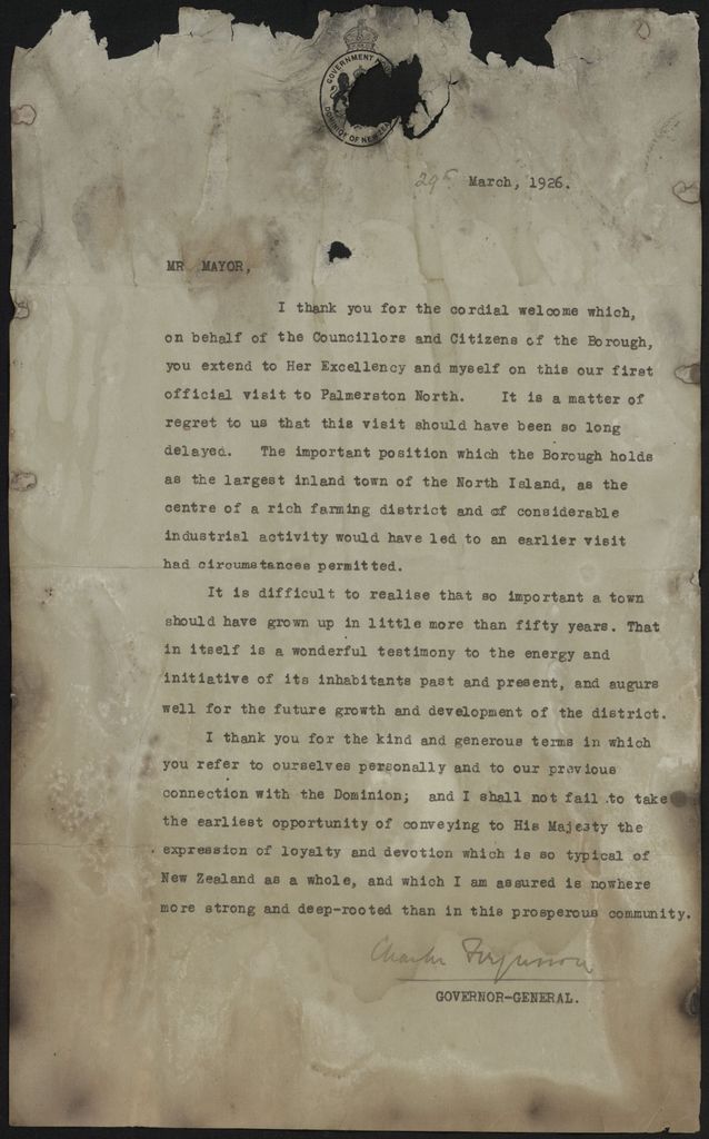 Letter from Sir Charles Ferguson to the Mayor of Palmerston North