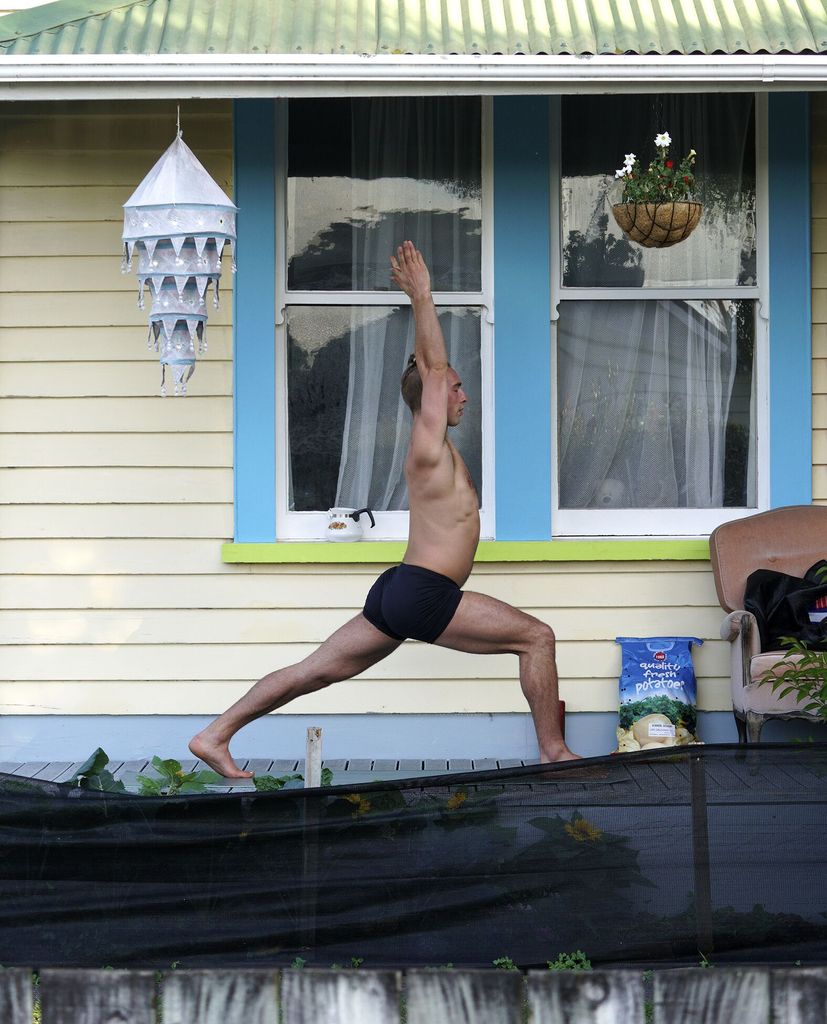 Matthew, a junior doctor from Palmerston North Hospital gets in some yoga between shifts. He has only been working and living in Palmerston North for a month. He can't get to the gym which is a problem because he likes doing weights. He's having to make do with yoga on the deck of his flat for now and is expecting to get pretty limber over the next few weeks. His flatmates are inside making their evening meal.