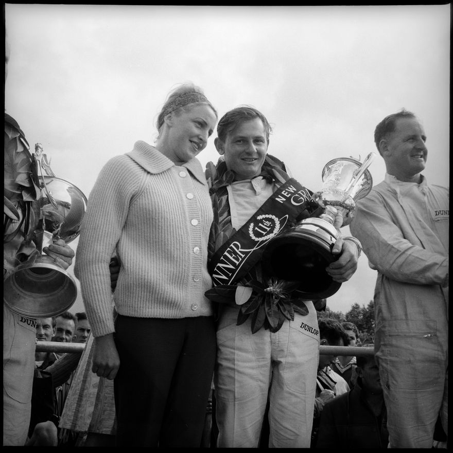 This image was not published in The Manawatu Evening Standard, taken on 20 January, 1964. [Bruce McLaren and unknown woman at the 1964 New Zealand Grand Prix award ceremony. Denny Hulme is to the right.]