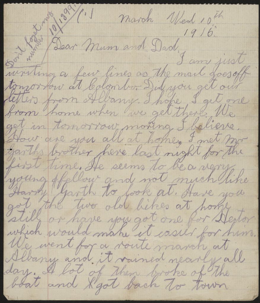 Len Argyle (1894-1915) was one of the sons of Henry and Alice Argyle of Bunnythorpe. He and his brother Pat (Percival) enlisted in the NZ Expeditionary Forces together and served in World War One. This letter from Len to his parents, was sent from the ship that took them to Egypt after training at Trentham.