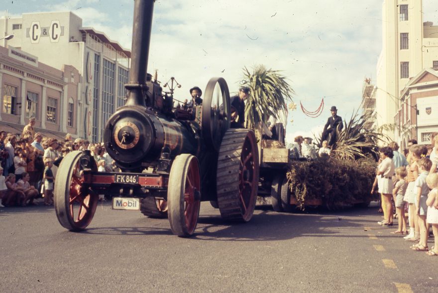 A traction engine tows a float in the Centennial Parade. 92 floats took part at the Palmerston North City Centennial celebrations of 1971. Approx. 10,000 people were present at the event to celebrate 100 years of Palmerston North.