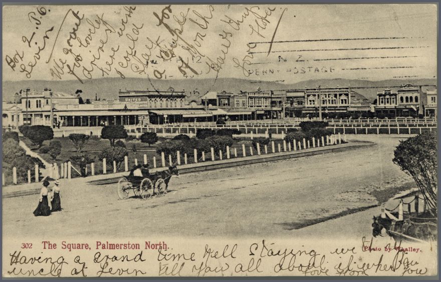 Visible in this postcard are two women and a cart with a donkey on Rangitikei Street, which at the time extended into the Square itself. The shops on Main Street East include: [On the Square] Evening Standard Building, United Farmers Cooperative Association (1895-1908), Solomon Abraham (land agents), A Turner's drapery, [On Church Street] The Club Hotel, J S Watchorn's drapery (until 1908), Bradfield's grocery, Crown Studios (photography). This postcard reads: "Dear Noelle, I think this is a rather good view of Palmerston North, so I am sending it to you. Yr [your] affect. [affectionate] friend, C Stanford."