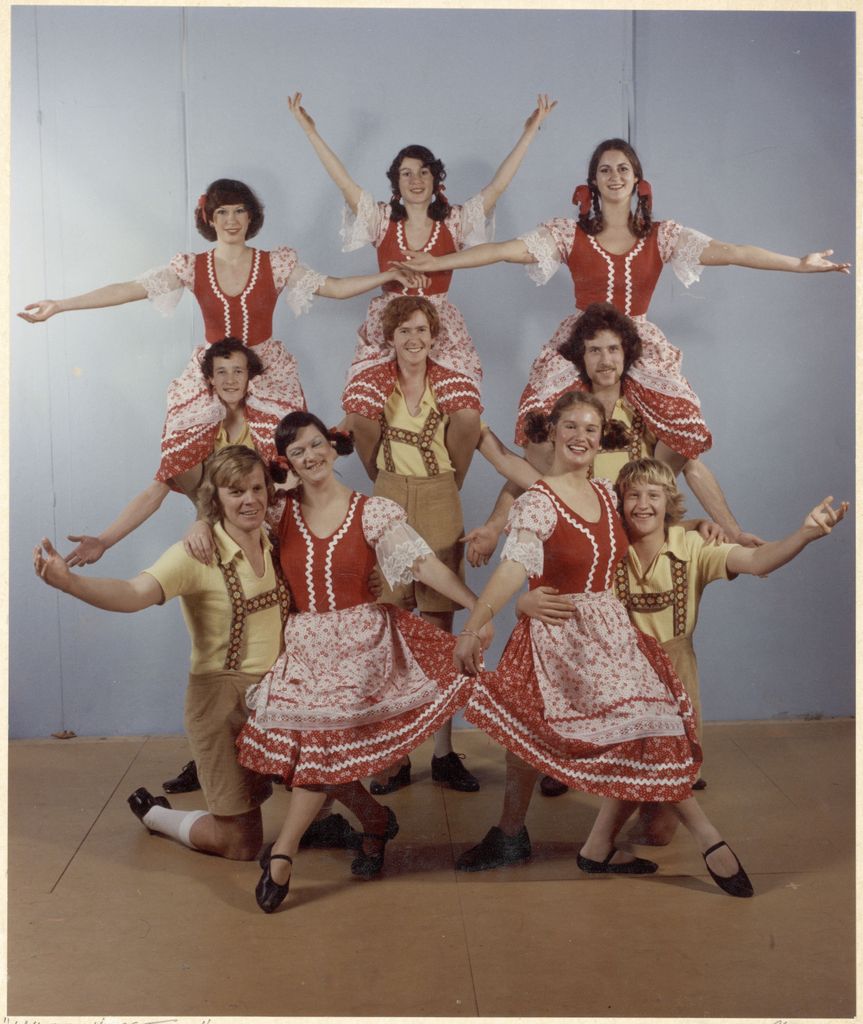 This is a publicity shot from "White Horse Inn" taken by Palmerston North photographer John Cleland. The date is an estimate based on the costuming.