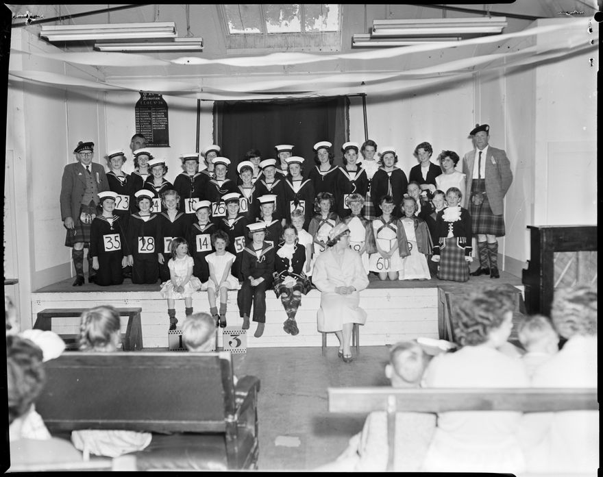 This image was not published in The Manawatu Evening Standard, taken on unknown date. “Unidentified group of children performing dressed in navy uniforms, nurses uniforms and some in Scottish kilts.”