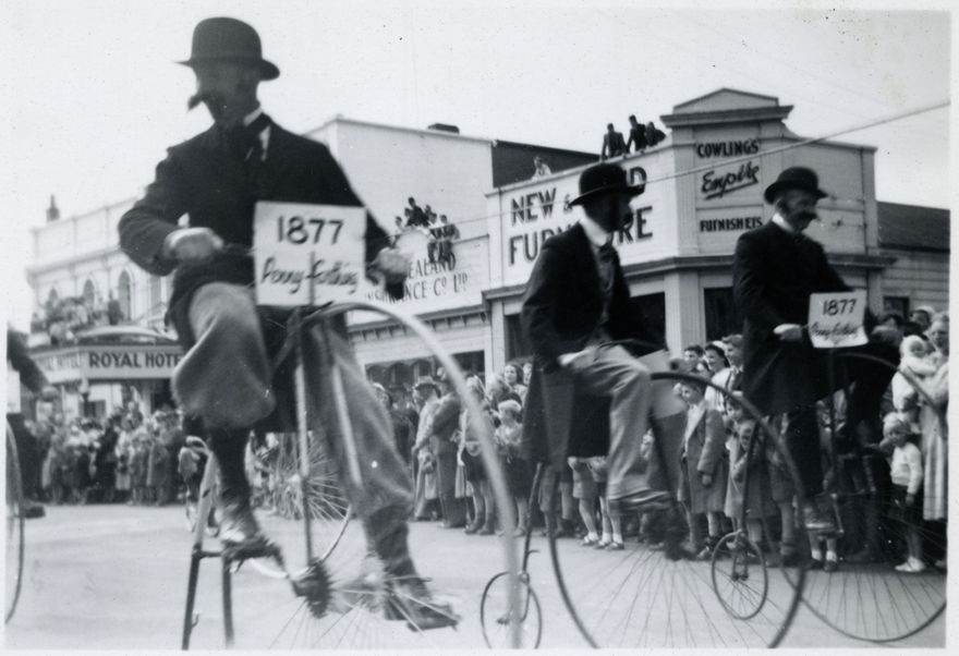 Palmerston North held its 75th Jubilee Celebrations during the week of 15th March 1952. Shown here are several men in bowler hats and false moustaches riding penny-farthing bicycles down Rangitikei Street. People watching the parade from the balcony of the Royal Hotel and the New Zealand Insurance Co Ltd building roof are visible.