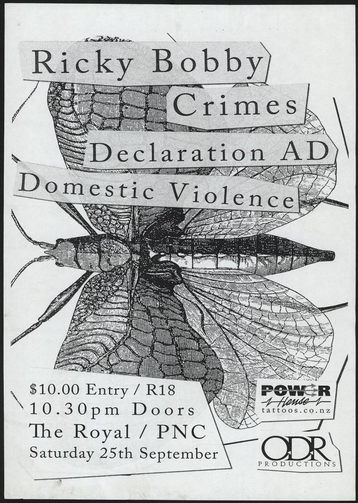 Ricky Bobby, Crimes, Declaration AD, Domestic Violence. $10.00 Entry/R18. 10.30pm Doors. The Royal/PNC Saturday 25th September. Power House tattoos.co.nz. ODR productions. Part of a collection of posters that were displayed at The Stomach, Lombard Street, venue for Creative Sounds Society Incorporated.