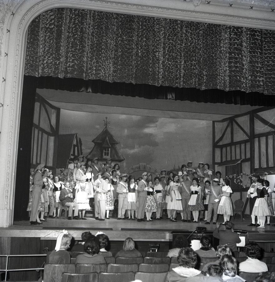 The Palmeston North Operatic Society are shown here performing 'The Drinking Song' during rehearsals for their production of "The Student Prince", in the Palmerston North Opera House. This photograph ran in the Manawatu Evening Standard, 23 August 1963.