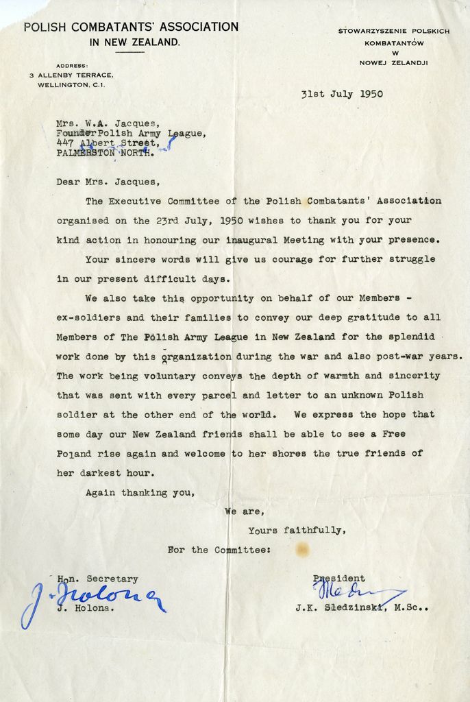 Letter from the Polish Combatants Association of New Zealand to the Polish Army League, thanking them for their work done during World War Two and beyond. The Polish Army League, founded in Palmerston North in WWII, corresponded with and sent parcels to Polish soldiers who served with the allies in World War Two.