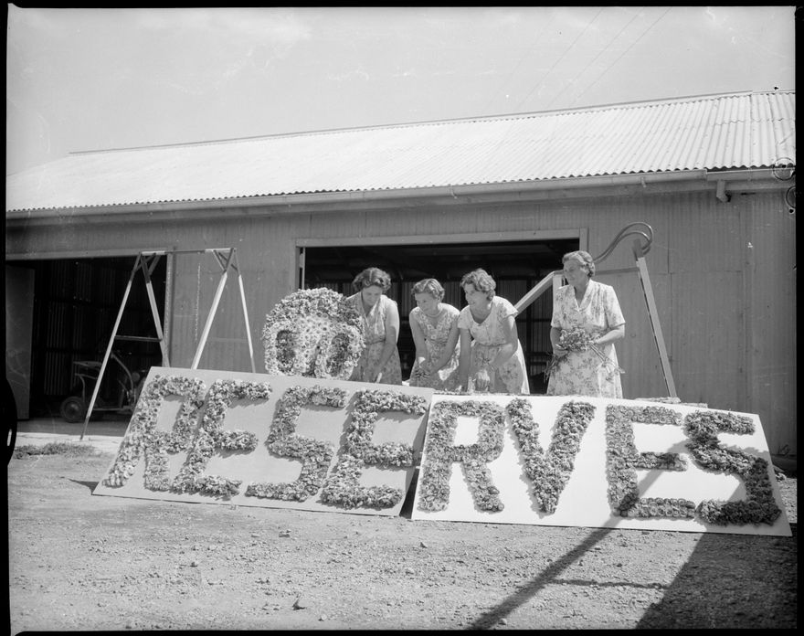 This image was taken for a story that ran in The Manawatu Evening Standard on 21 February 1958, page 6: "Much work has been involved in the construction of the City Council float for the floral procession tomorrow. Here (from left), Mesdames V. Watt, M. Eccleston, D. Saggers and D. Heggie are placing blooms in position. "