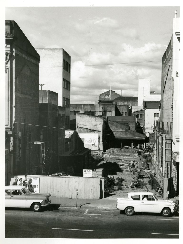 This photograph was commissioned by the bank to document the construction of the new building. The first branch of the Bank of New South Wales opened in the Royal Hotel (1901-1905). On January 1 1906, the branch moved into a leased building on Main Street opposite the Post Office. On October 27 1914, the bank moved into these purpose-built premises at 18 Rangitikei Street. This was demolished to make way for a new building, which was occupied May 29 1967. Customers were briefly served by the city's mayor (G M Rennie) and Mayoress, as well as the wives of both the Chief Manager and Branch Manager.