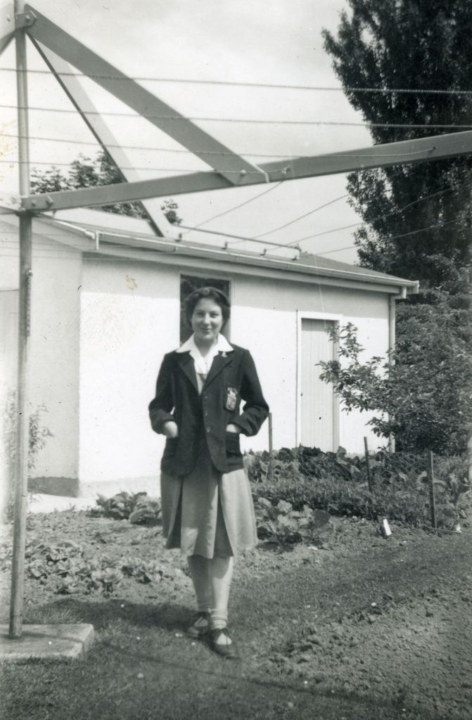 Pat Hayes (later Eaton) in her Palmerston North Girls High School uniform, taken in the backyard of 11 Anderson Street, Palmerston North.