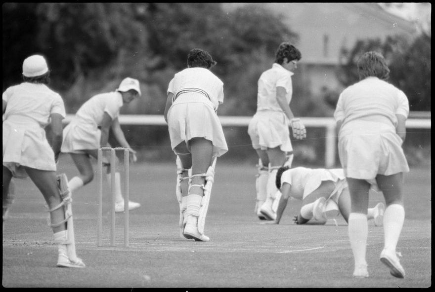 This image was taken (but not used) by the Evening Standard on 21st of January 1982. It depicts the New Zealand women’s cricket team taking on the International XI women’s team in a limited over match for the Hansell's Vita Fresh Women's World Cup 1981/1982. The match was held at Fitzherbert Park in Palmerston North. The New Zealand team won by 97 runs.