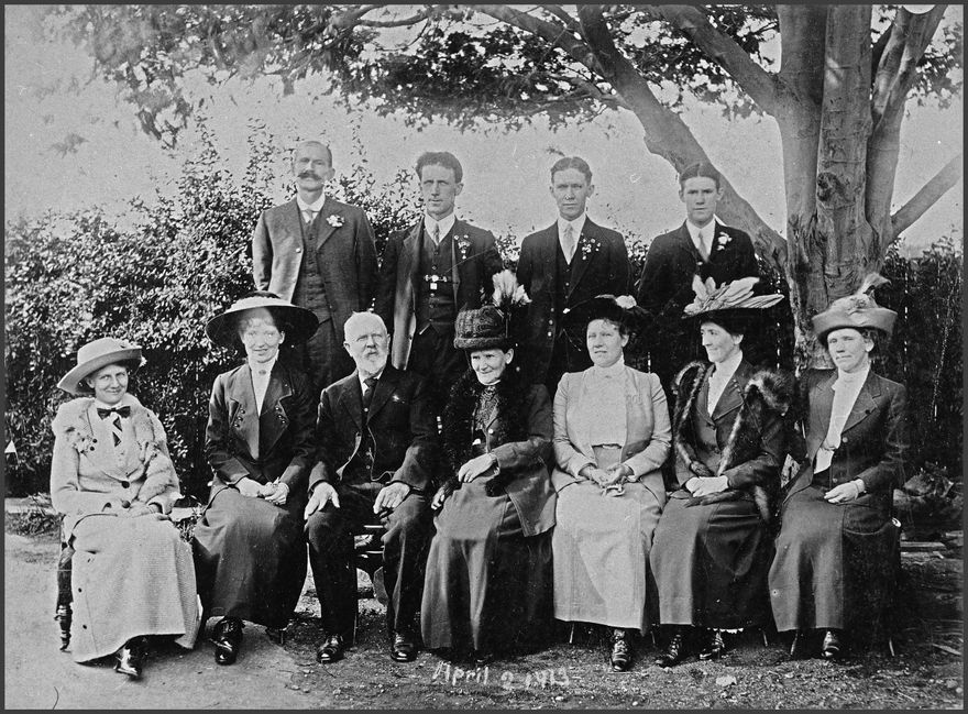 John Edmund Perrin (1844-1914) was partner in the firm of Meyrick, Perrin & Oakley, building contractors. Back Row (left to right): Ernest ("son"), John Halford, George and Cecil.Front Row (left to right): Ethel ( Mrs P. Stuart), Isabel (Mrs C. Allen, later Mrs W. Howes), John Edmund Perrin (father), Matilda Perrin (mother), Gertrude (Mrs P. Larcomb), Ada (Mrs F. Needham) and Rachel (Mrs E. Pratt).