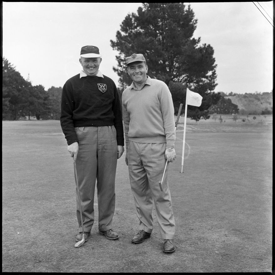This image was taken for a story that ran in the Manawatu Evening Standard on 15 April 1963, "G. F. Lindsay (Manawatu), G. Cunningham (Hastings), the semi-finalists in the Easter golf championship at Hokowhitu today."