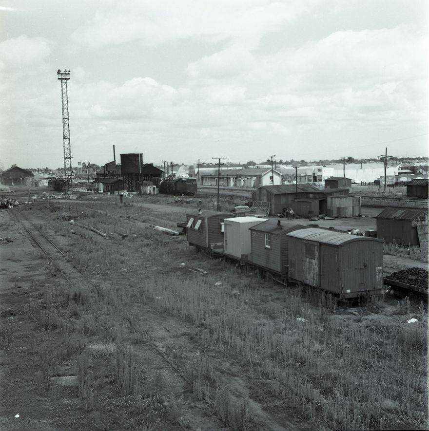 This photograph is from a series taken for a story that ran in the Manawatu Evening Standard, February 22 1965 with the caption: "The old railway yards looking south now appear more like a ghost town, with a flourishing growth of weeds."