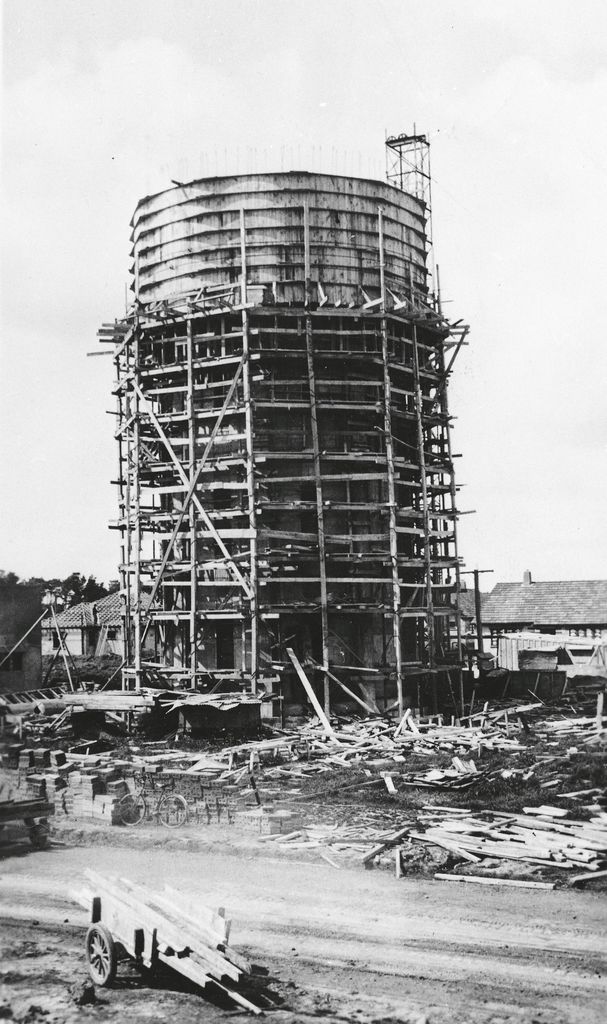 This photograph is part of a series taken by Thomas Doherty, a steel construction worker. The water tower for Ohakea Base is shown here under construction.