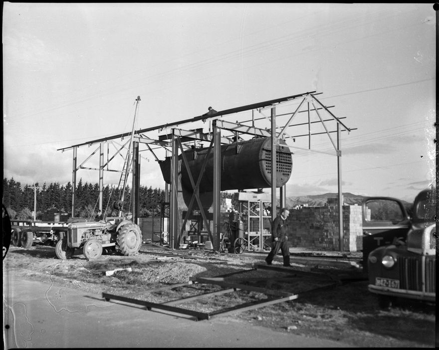 This image was taken for a story that ran in The Manawatu Evening Standard on 8 July 1958, page 9: "The Minister of Works has a contract to install a boiler at Linton Camp. This photograph shows the construction to date. The boiler will provide steam for cooking and other amenities."