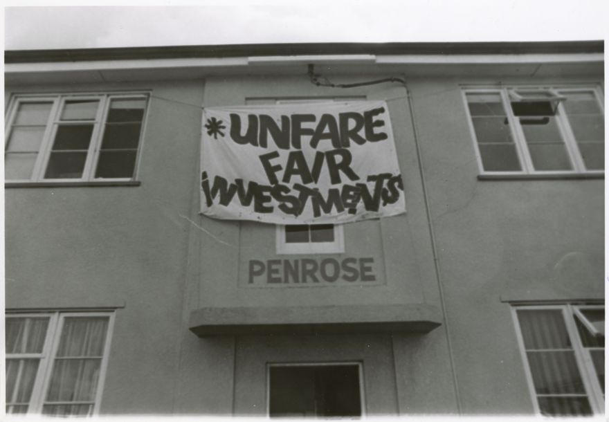 Banner hanging from the front of the Penrose flats building, reading 'Unfare Fair Investments'. The protest also related to the Edendale flats next door. Fair Investments owned the two blocks of flats built in 1949 and the protest was against their plans to demolish the buildings, and the eviction notices served on the tenants. The Palmerston North City Council became involved and subsequently bought the flats for Council housing and relocated them 80 metres along Rangitikei Street in 1984, near the entrance to Queen Elizabeth College.