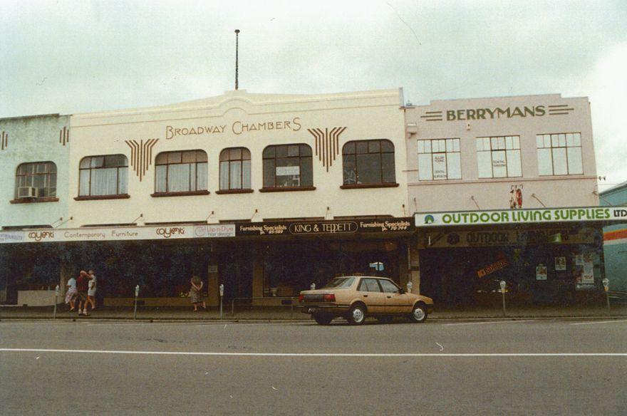 Broadway Chambers was built in 1936. it has since been renovated and remains as retail outlets. Berrymans was built for A.J. Berryman of Palmerston Northc 1932, initially as a music shop business which later expanded into sports equipment. Berrymans Lane is on the extreme right.