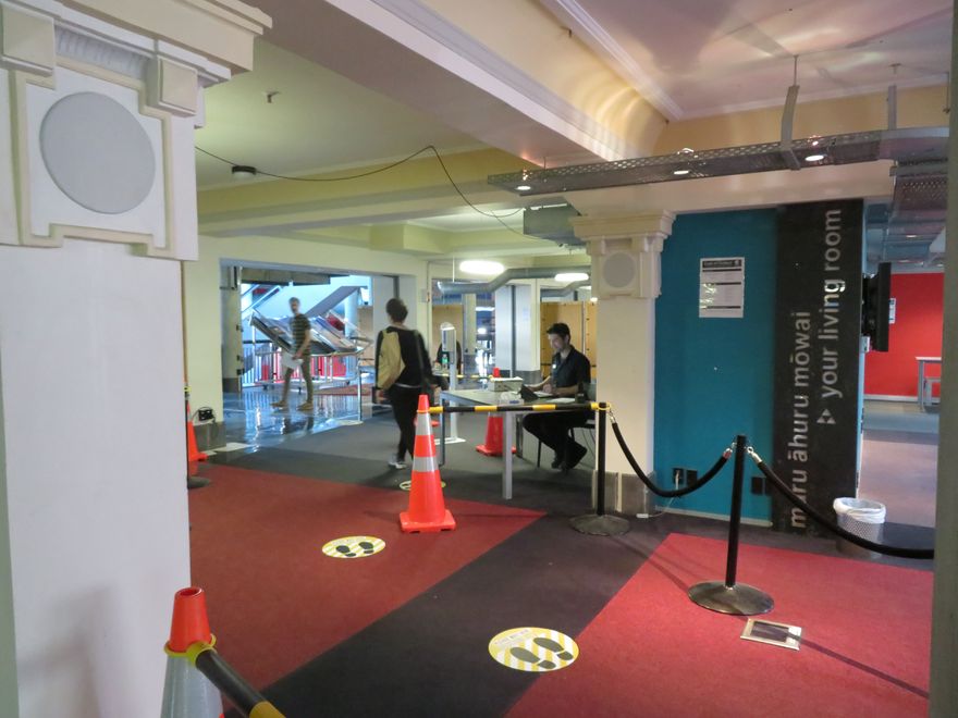 - The altered layout of the mezzaine level of the Palmerston North City Library. The computers were moved to the ground floor and contact tracing measures were implemented for anyone entering the library.