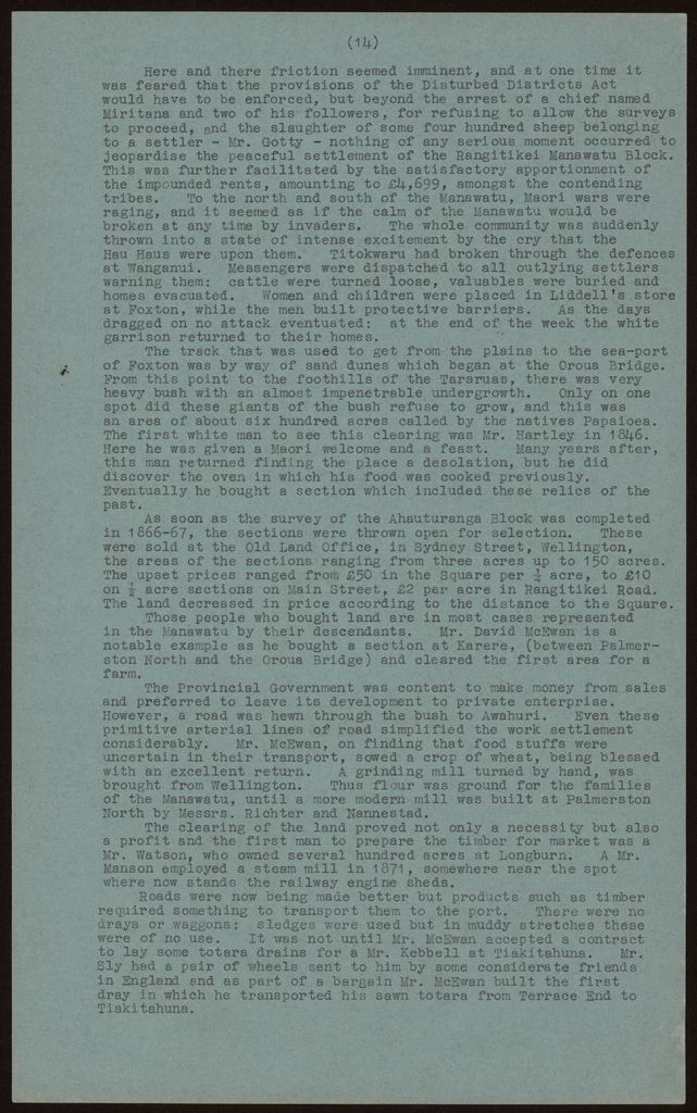 The history of the Manawatū outlined, followed by some newspaper cuttings and then images of Palmerston North from 1877 - 1927 and 1937.