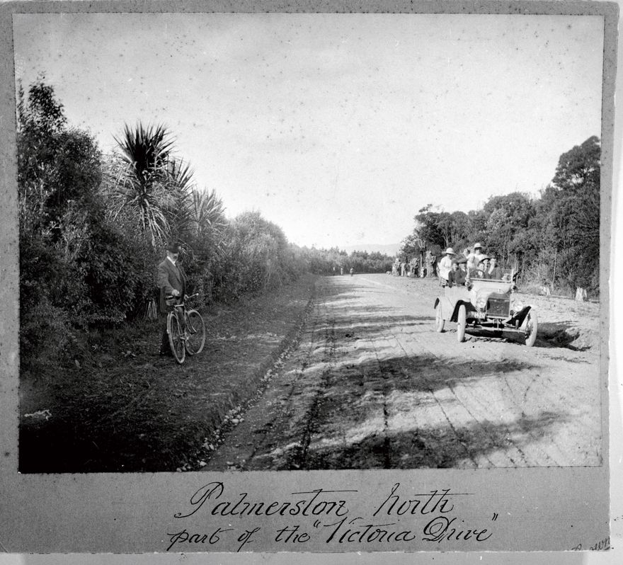 “Queen Victoria Drive” or Victoria Drive as it is more commonly known was started in c1917 with a rough track being put through from Fitzherbert Avenue to Park Road. In 1919, it was properly laid out and metalled and in c1920 – 1921 was finally tarred and sanded. Many native plants and trees were planted bordering the drive, some which still remain. This photograph shows many residents of the Palmerston North enjoying various modes of transportation - whether on foot, by bicycle and by means of automobile.