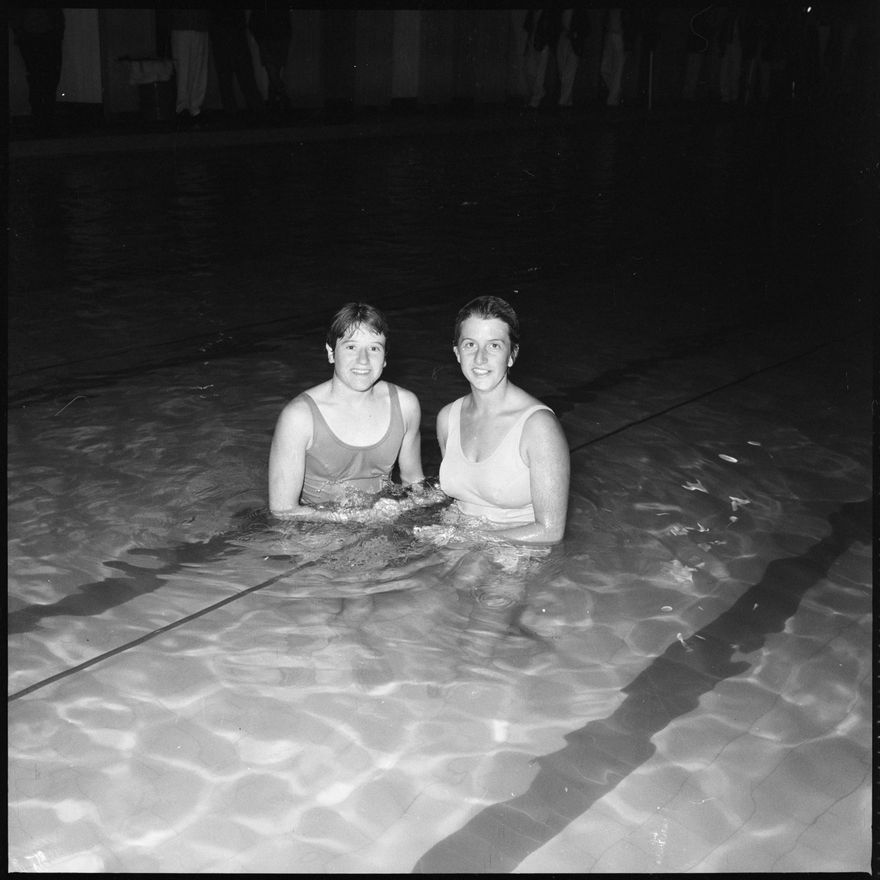 This image was not published in The Manawatu Evening Standard, taken on 16th January, 1963. [Two young women standing in a pool]