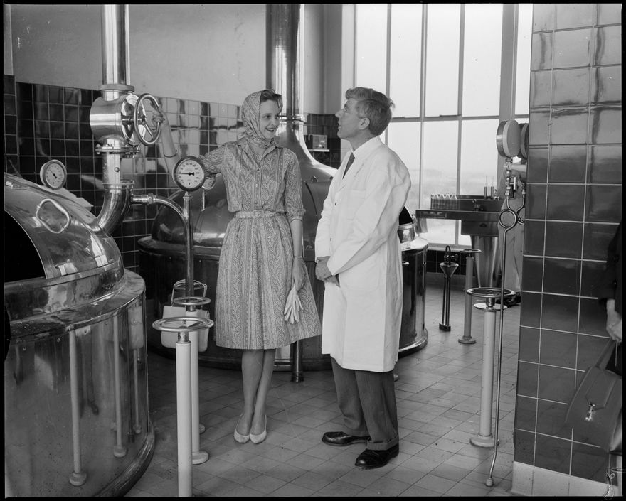 This image was taken for a story that ran in The Manawatu Evening Standard on 13 October 1960 ""Miss British Cotton" (Miss Terry Downshire), who is in New Zealand to demonstrate cotton, made a tour of the Standard Brewery this morning. Miss Downshire listens to Mr. R.C. Lawrence, the head brewer, as he explains the workings of some of the equipment."