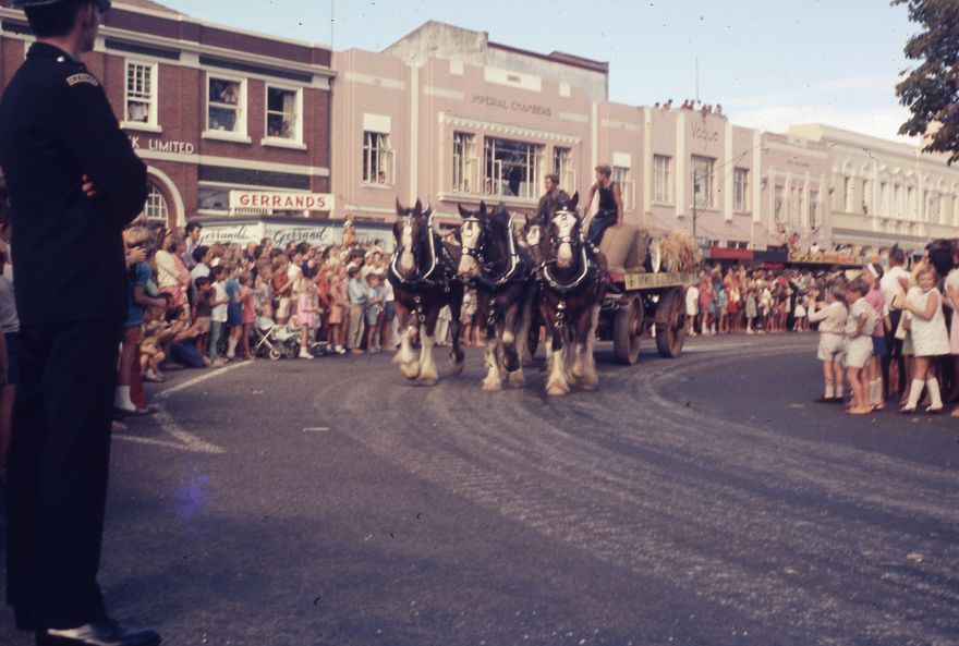 A brewery float is towed by clydesdale horses during the Centennial Parade. 92 floats took part at the Palmerston North City Centennial celebrations of 1971. Approx. 10,000 people were present at the event to celebrate 100 years of Palmerston North.