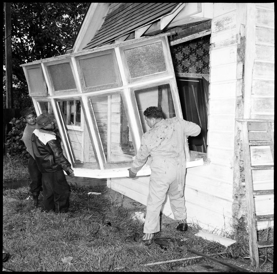 This image was taken for a story that ran in The Manawatu Evening Standard on 18 April 1961 "Casement windows were removed from an old house in Cuba Street by men who described themselves as wreckers today. They are members of a tribal committee, Messrs. P. Governor, J. Marimo and M. Keti, who are preparing the site for the Maori Memorial Community Centre."