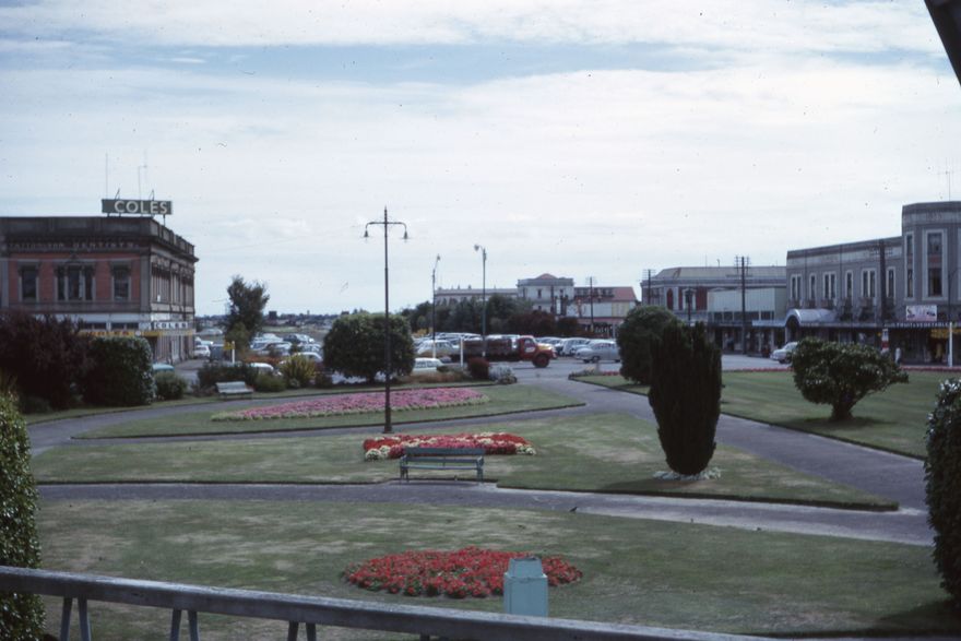 The view looking down Main Street towards the west, once the Railway line had been relocated to Tremaine Avenue. Coles building can be seen on one corner with the Commercial Hotel on the other. This site will become the location of the Palmerston North Civic Administration Building.