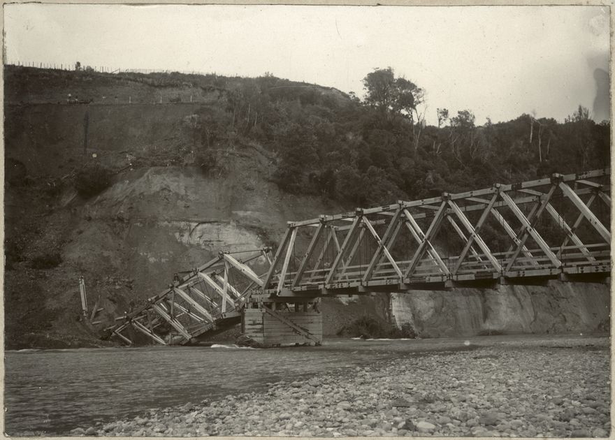 This photograph shows the Raumai Bridge on the Pohangina River, damaged by a slip in August of 1907. A report of the incident is in the Manawatu Evening Standard newspaper 28 August 1907, p5.