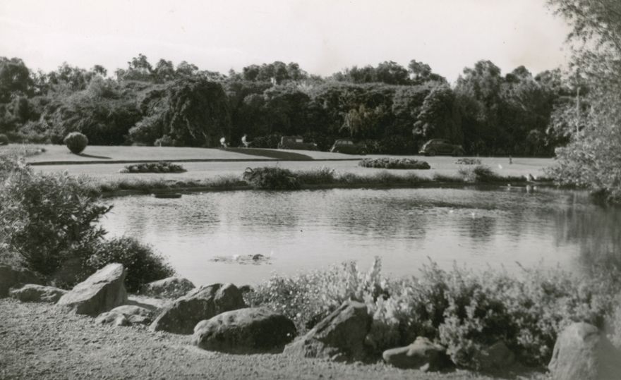 This photograph shows the lily pond in the Victoria Esplanade. A cluster of lilies is visible in the water towards the front of the photograph. The Victoria Esplanade underwent a variety of improvements under Peter Black, the Curator of Reserves from 1908-1946. These included various footpaths, Victoria Drive, mass plantings (notably of the cherry trees and phoenix palms), the creation of a pergola, a tea kiosk, the lily pond the RSA paddling pool and a begonia hothouse (now known as the “Peter Black Conservatory”).