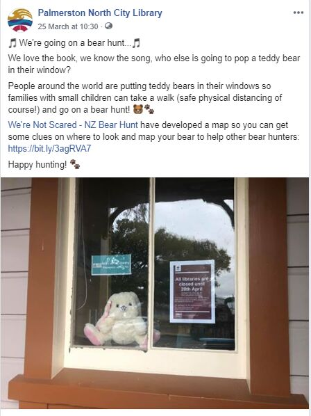 During the COVID-19 Pandemic of 2020 many of the community put teddy bears and other soft toys in their windows. The idea was that families with small children could walk around their local area and look out for bears. Exercising in your local area was one of the few reasons people were allowed to leave their homes, apart from accessing groceries or other essential services. While doing so they had to keep a distance of 2m from people not from their home at all times to avoid spread of the virus. The bear hunt idea was related to the children's storybook 'We're going on a bear hunt' by Michael Rosen and was shared widely on Facebook around the world. Prime Minister Jacinda Arden even displayed a teddy bear in the window at her home. Pictured is a toy bunny in the window at Ashhurst Library, captured by an Ashhurst Librarian.