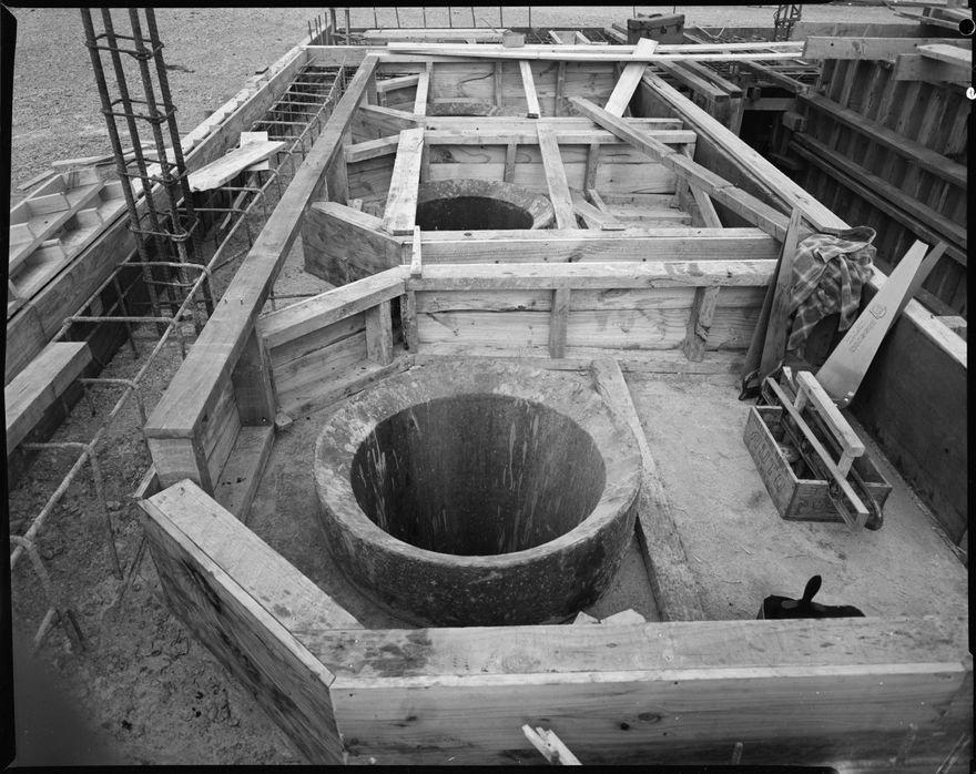 The sewerage treatment plant beside the Manawatu River opened in 1968, replacing the septic tank and filter beds which had been in use since 1905. Some images from this collection have been digitised from prints housed in other archival collections. This image is from an original negative.
