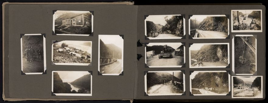 Dated from the 1920s and 1930s, this photograph album depicts events on the Manawatū Gorge road including construction and repairs of the road, removing slips, car accidents etc. The album also contains images of Napier following the earthquake of 1931. The photographs were shot by William (Bill) Brockie. Individuals are unidentified.