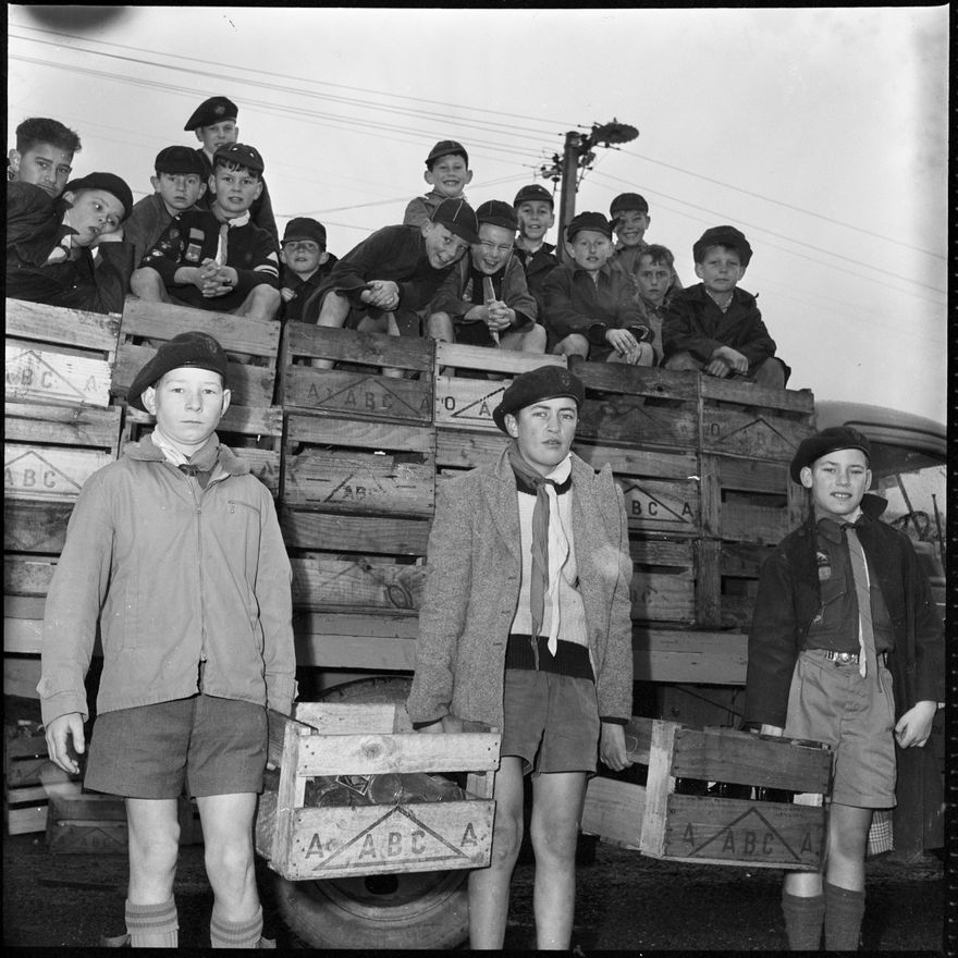 This image was taken for a story that ran in the Manawatu Evening Standard on 15 July, 1963. "Doing their good deed for the day are these three Roslyn Scouts, C. Trail (left), F. Skelton (centre), and D. Sherriff. With other members of the group, they were helping the bottle drive for funds for extensions for their Scout den."