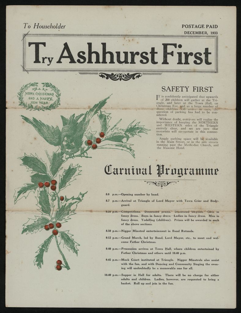 A community newspaper for the Manawatu township of Ashhurst. Contains social news and local advertising. This edition includes the Christmas programme of events, and advertisements for: T. C Templeton, newsagent; W N Brewer, saddlery and boot store; The Corner Store; E Morris, butcher; J A McDonnell, insurance agent; Wyercherley Bros, carriers and contractors, The Ashhurst Garage (F. N. Rosenbeck); J Flowers, plumber; Currie Bros, merchants.