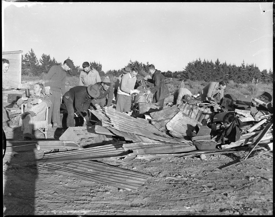 This image was taken for a story that ran in The Manawatu Evening Standard on 27 June, 1959. "The Takaro area was spring cleaned by the Palmerston North Jaycees today. It is the second portion of the city to receive the benefit of this annual project. The salvageable rubbish is sorted out and will later be sold, the proceeds from which will purchase equipment for the Intellectually Handicapped Children. The photograph shows several Jaycees sorting over the rubbish at the tip."